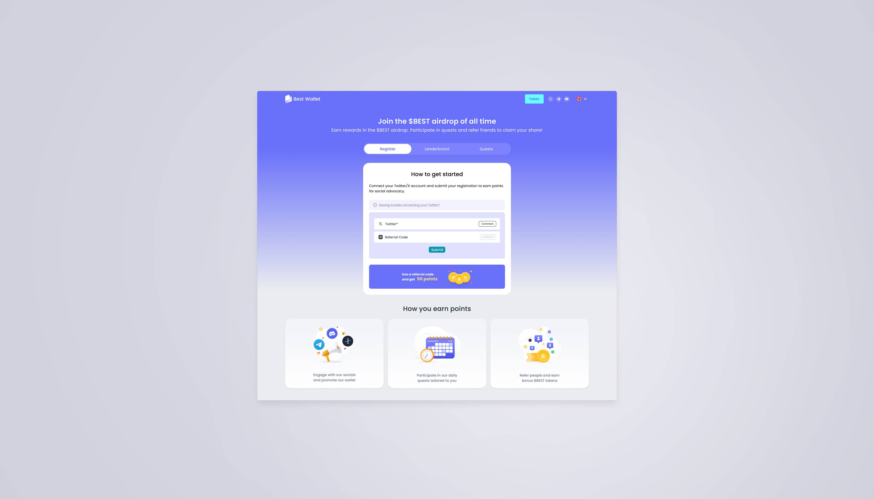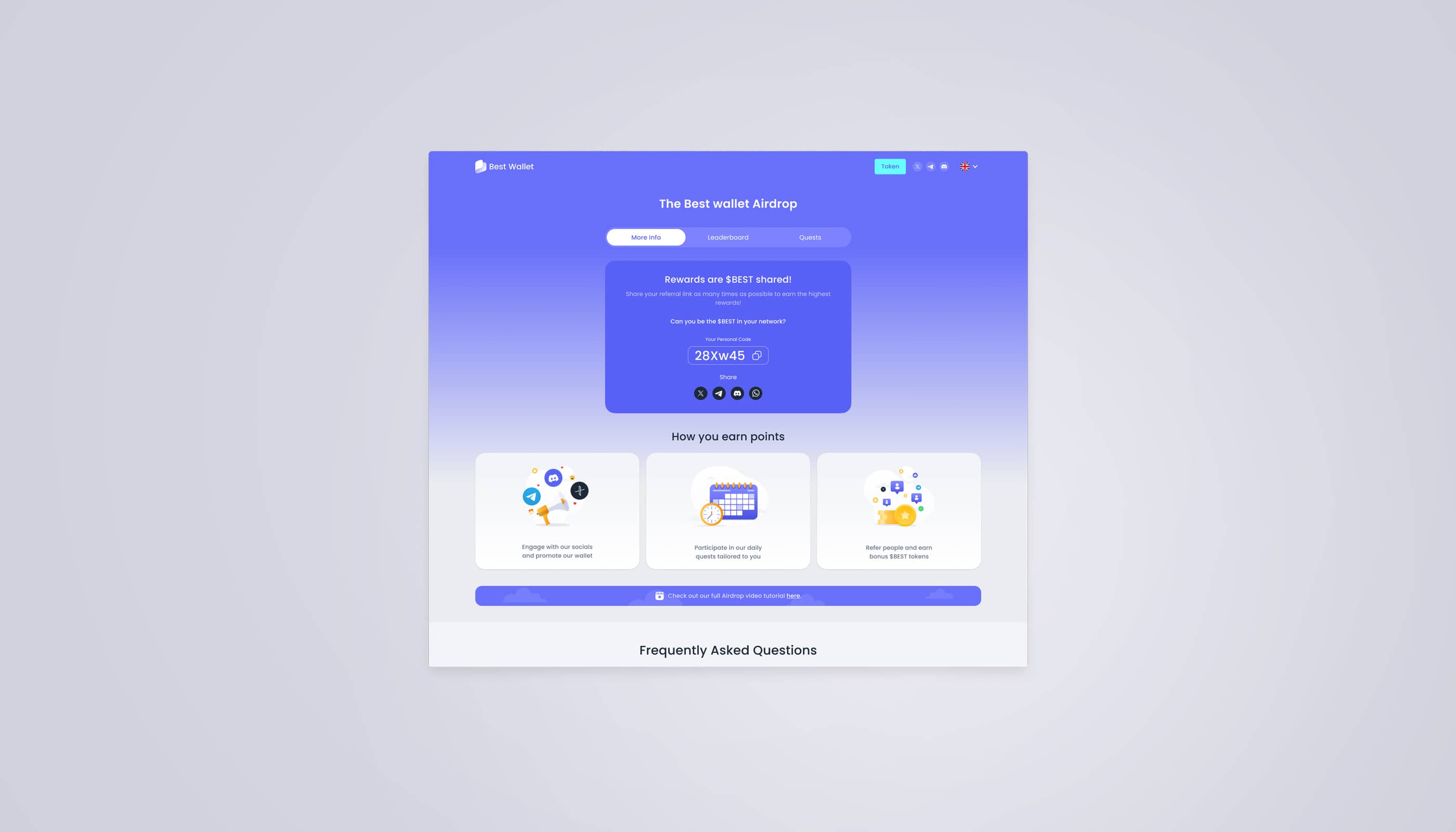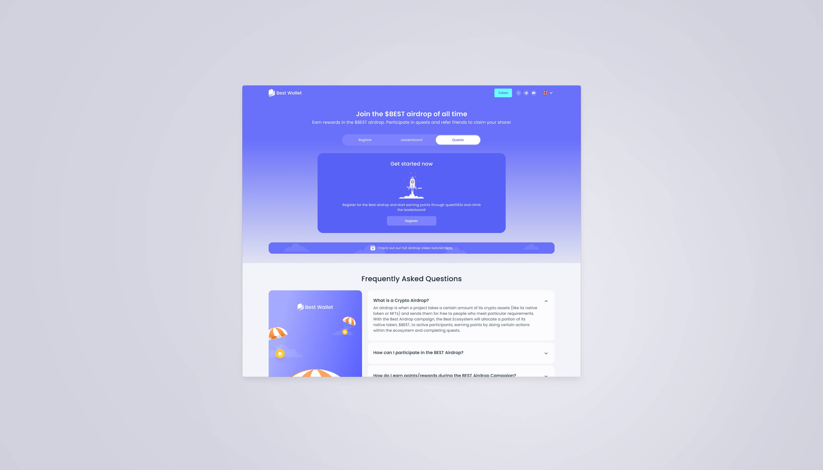 The Best Wallet Airdrop was a campaign to distribute $BEST tokens to early supporters through community-driven tasks. Users could register, complete Quests, track their progress, and refer others, earning points that would later convert to $BEST.