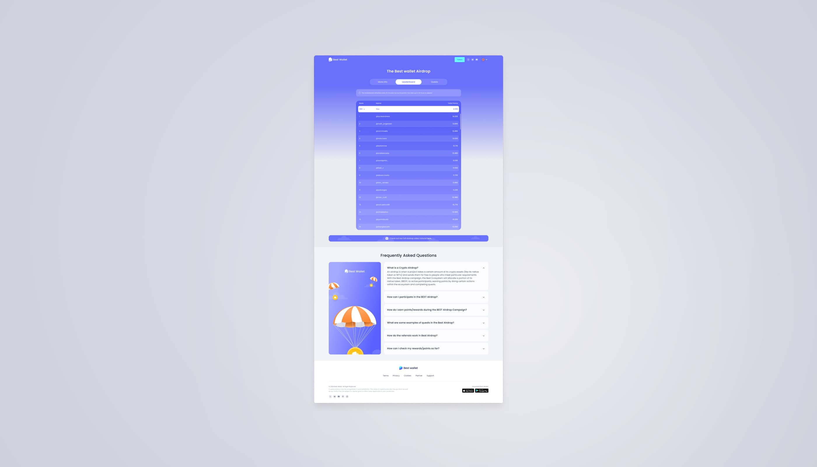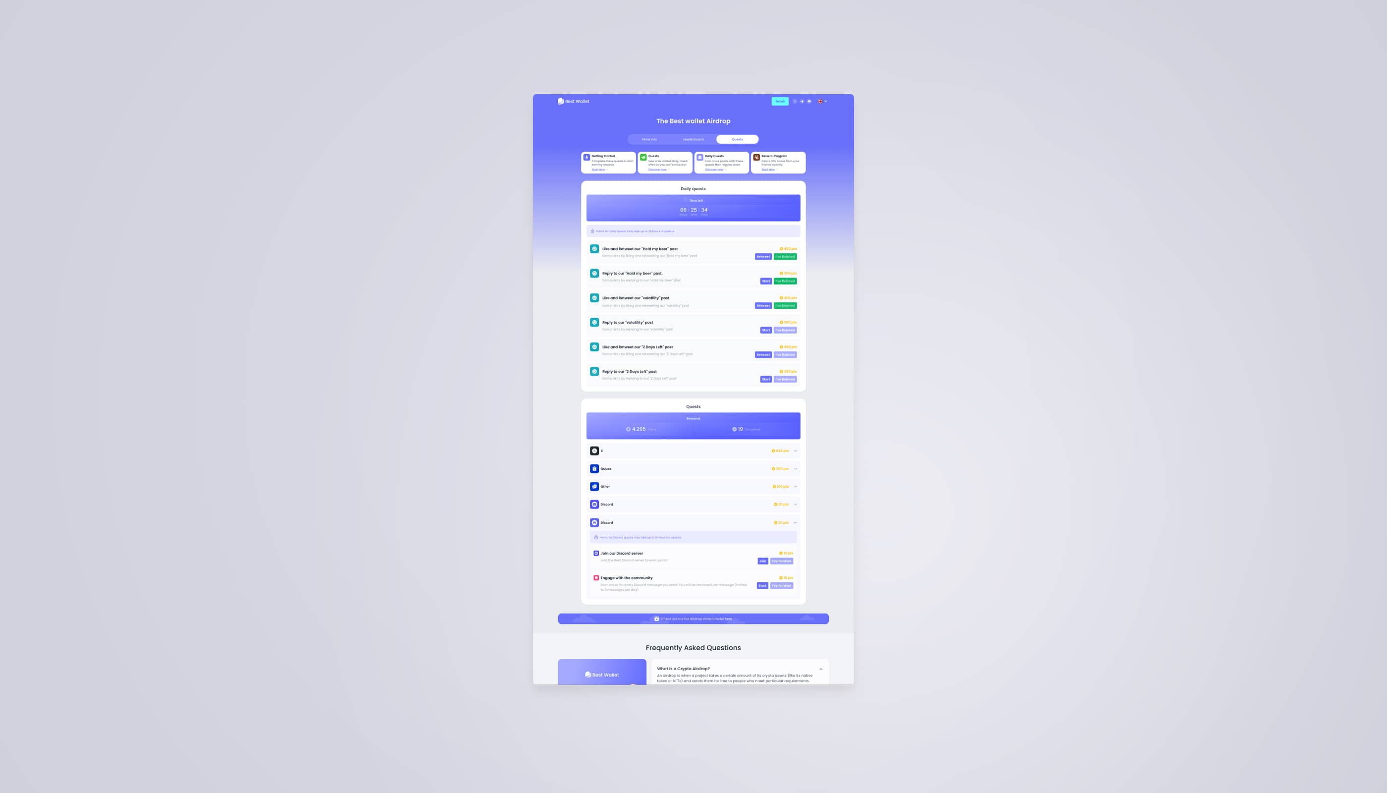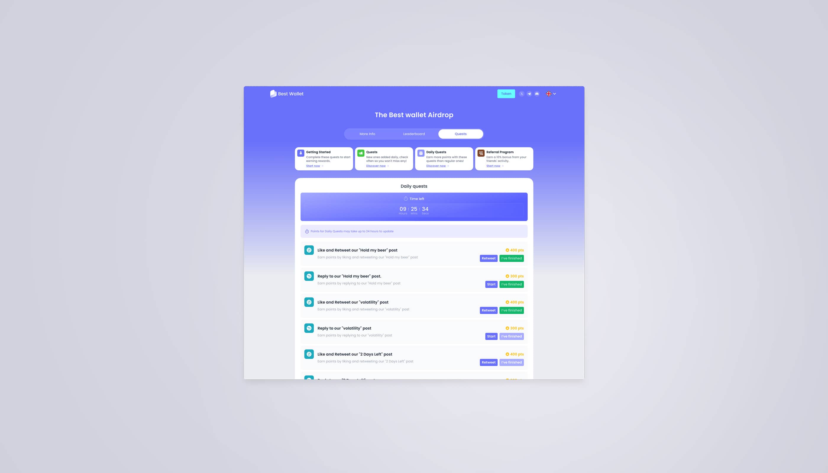 The Best Wallet Airdrop was a campaign to distribute $BEST tokens to early supporters through community-driven tasks. Users could register, complete Quests, track their progress, and refer others, earning points that would later convert to $BEST.